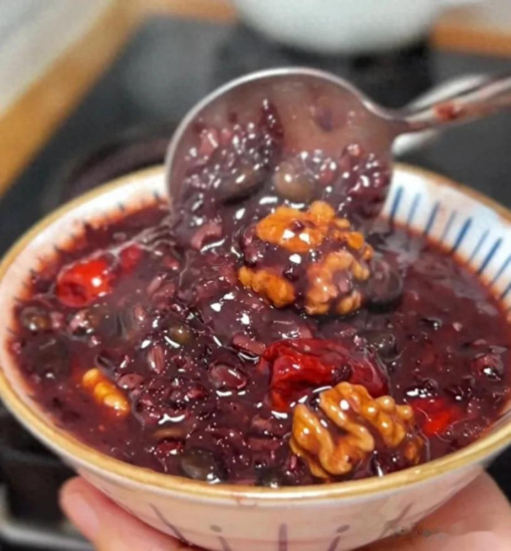 这碗粥是“以黑养肾”的经典搭配,黑米、黑豆、黑芝麻的组合,再加上核桃和红枣,口感绵密又香甜。