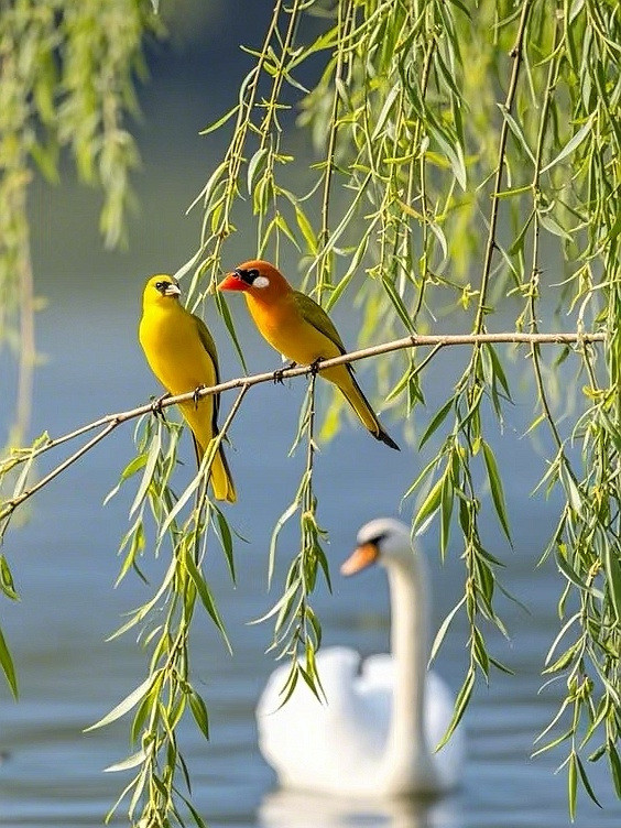 它们的鸣声并不只调:立在柳梢的,叫得最响,“叽叽——叽叽——”拖长声调,似在呼叫同伴,出像是宣示领地;亭角那只,良晌应酬,“啾啾、啾啾”一声接一声,带着几分亲昵,算是应酬。