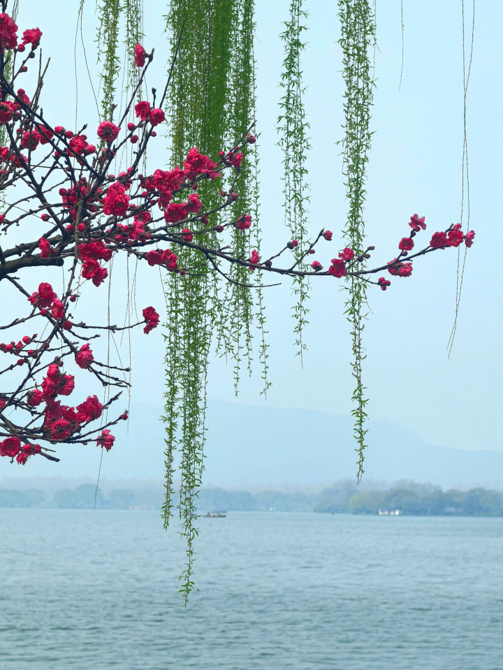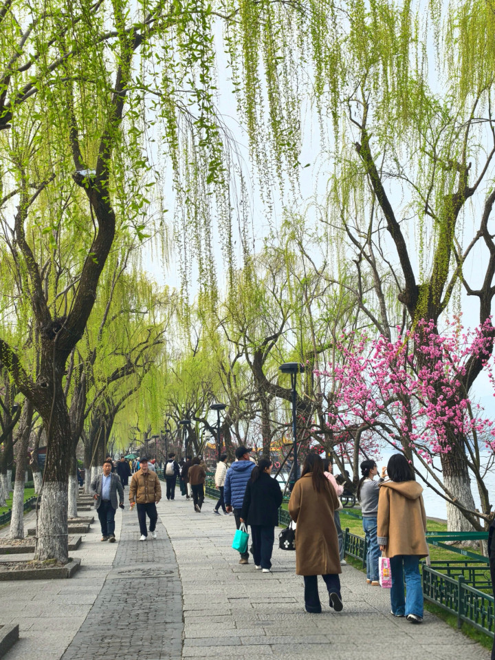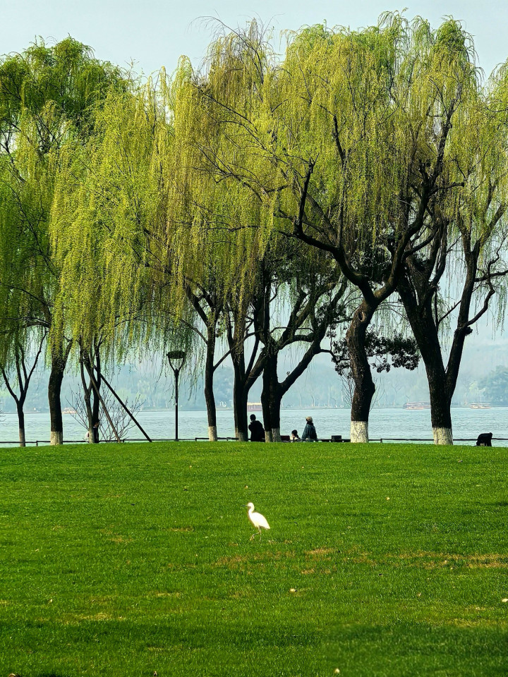 这天黎明,我七点吃过早饭,坐地铁到吴山广场,出站骑了一段路。入园后穿过两侧成排的新植柳林,来到湖畔。垂柳的枝条垂到水面,新抽的柳芽嫩得能掐出水来。万千柳丝在微风中轻轻起舞,如江南女子提着裙摆转折而行,绿浪一层叠着一层,看得东说念主心醉神迷。