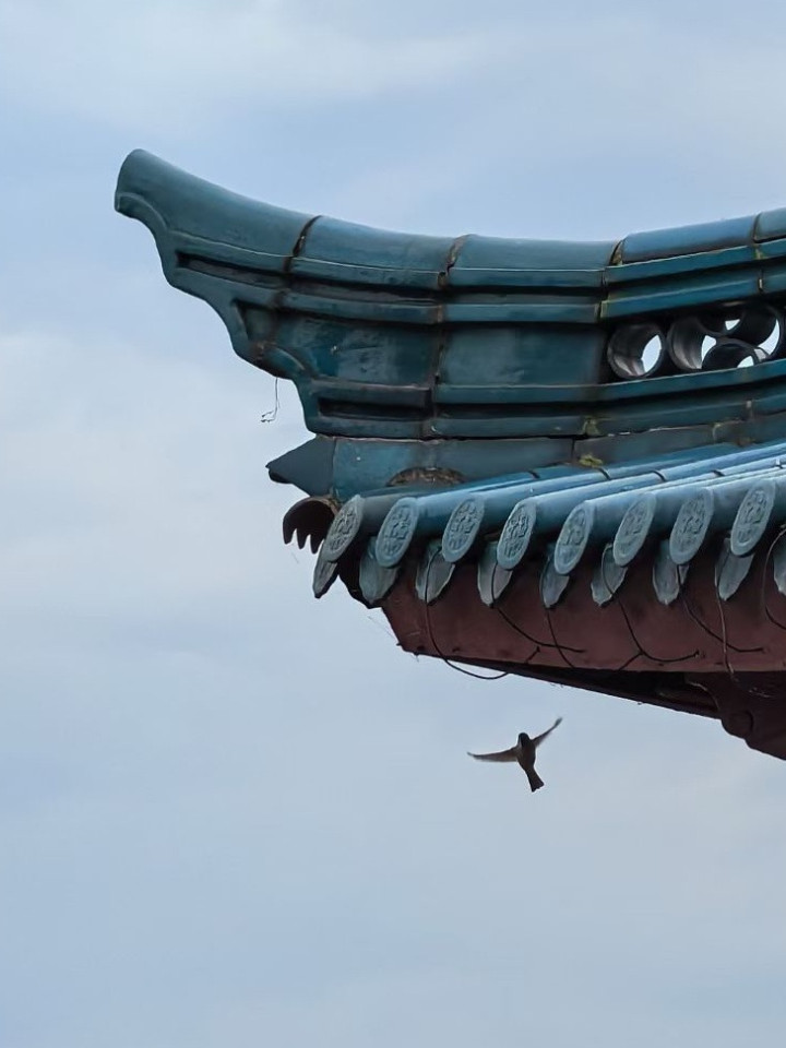 小麻雀就偏疼这个“湖景房”。它们在亭檐与柳梢之间飞来飞去,胆子大,手脚敏捷,常飞到亭顶瓦缝、梁柱间栖息。