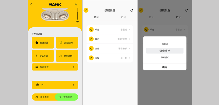 耳机的触控区域成立在两侧的NANK LOGO上,操作逻辑了了易懂:单击左耳裁减音量,单击右耳增多音量;双击纵情一侧可播放/暂停;长按左耳切上一首,长按右耳切下一首;三击左耳叫醒语音助手,三击右耳则可开启游戏模式。粗浅学习后,上手照旧很快的。