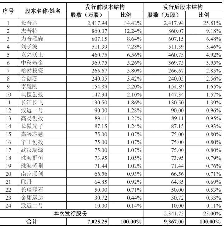 IPO后,长合芯捏股为25.81%,杰普特捏股为9.18%,力合泓鑫捏股为6.48%,刘长波捏股为5.46%,嘉兴沃土捏股为4.92%,中移基金捏股为3.95%,华为旗下哈勃投资捏股为2.85%;