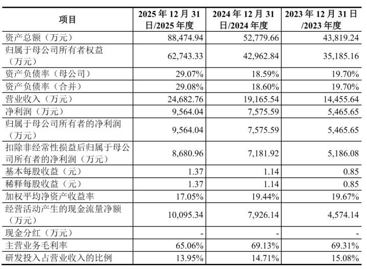 招股书露出,前途光子2023年、2024年、2025年营收永别为1.45亿元、1.92亿元、2.47亿元;净利永别为5465.65万元、7576万元、9564万元;扣非后净利永别为5186万元、7182万元、8681万元。