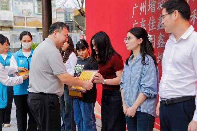 像片:增城区正果镇党委副文牍、镇长陈坚同道为志愿者颁发荣誉文凭