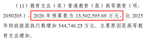 在教会部预算说明里,2026年高档教会开销的预算数是1350.26亿元, 和2025年比较多了54.47亿元。